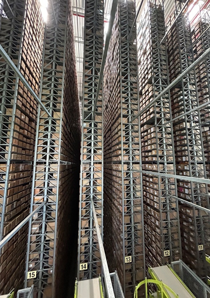 - Vollautomatische Ein- und Auslagerung von normierten Lieferantenkartons mit Regalbediengeräten