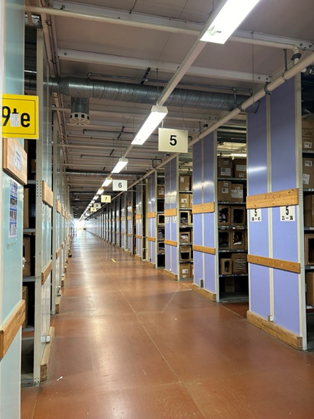 Hier „shoppen“ unsere Kolleg*innen für unsere Kund*innen. Die benötigte Ware wird aus dem jeweiligen Regal aus dem jeweiligen Karton genommen, mit einem Etikett beklebt und in eine von vier Kisten gelegt. Achtung! Hier herrscht die Regelung der Einbahnstraße, damit sich niemand in die Quere kommt. Die Kisten werden auf das Förderband gestellt und gelangen auf dem automatisierten Weg nun in den Versand.
